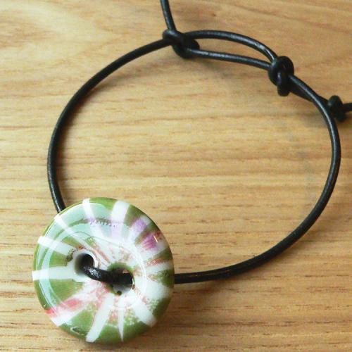 手軽に気軽に楽しんでいただきたいとの想いで、太さ2mmの皮ひもを通し、シンプルに楽しめるブレスレットにしました。