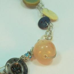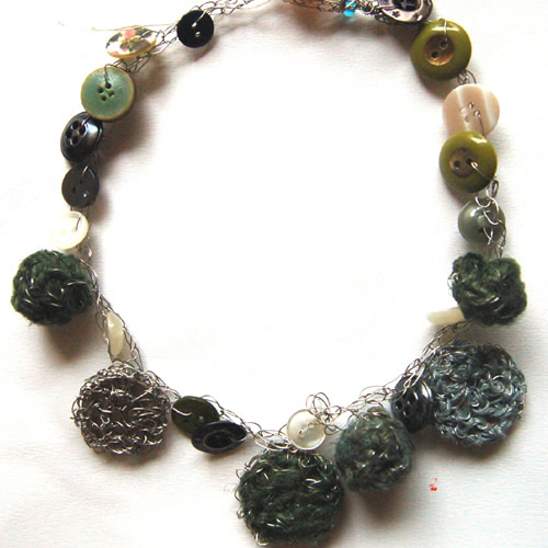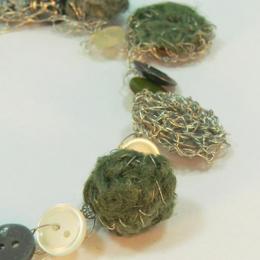 フィンランド森を思わせるような色とりどりのグリーンのグラデーションカラーのリネン糸にメタル素材、アンティークボタン、古いスウェーデンのコインなど様々な異素材を使用しながらもすっきりとした印象と個性的なデザイン。