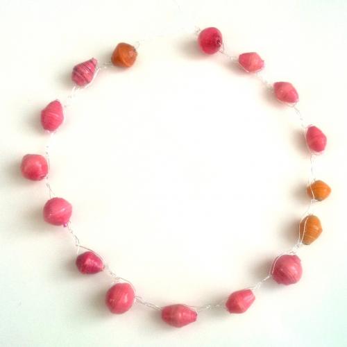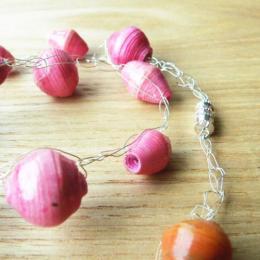 再生紙から出来たCaring Handsのビーズと銅ワイヤーの糸を使用したMaijaオリジナルのカギ編みネックレスシリーズ「Koruttomuus(コルットムース)」(英語で“ジュエリーをつけないシンプルビューティー”の意)。