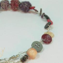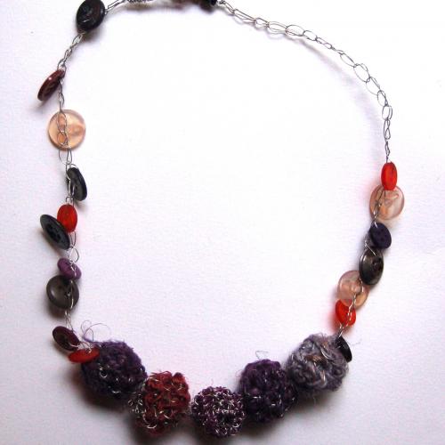 ベリーの色合いパープルのリネンの糸にメタル素材を組み合わせたころんとした 丸みのあるフォルムの温かみある編み物ネックレス。素朴でありながらエレガントな 雰囲気。