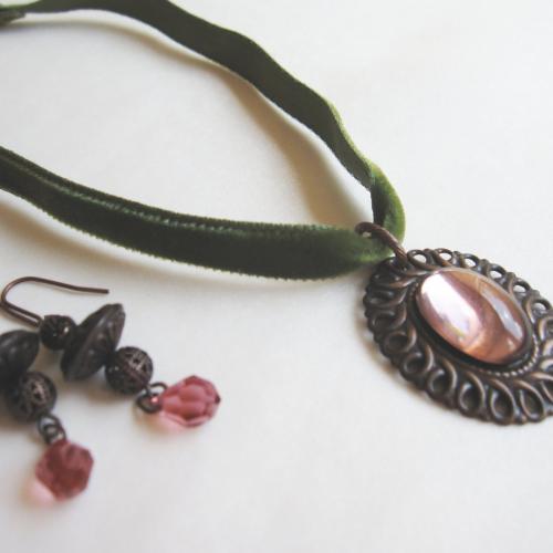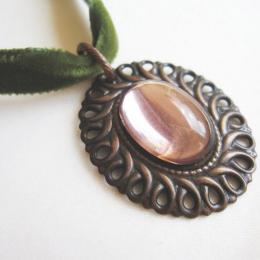 ブロンズ、アンティークローズ、オリーブという色のコラボレーションが、アンティークな雰囲気をプラス。シンプルなデザインでありながら存在感のあるチョーカーです。(ピアス「Vintage」 とセットで楽しめます)