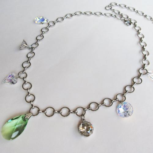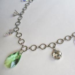 優しい新緑の様なペリドットを中心に、クリスタル、オーロラ、そして大人っぽいシルバーシェイドの石がアクセントになったネックレス。凛とシャープで、かつ爽やかに仕上げました。
