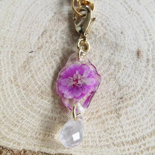 深いピンクとホワイトが可愛い、カモミールのお花を樹脂に閉じ込めたストラップ。 ドロップカットのローズクオーツとの組み合わせが女性らしく、優しげな印象です。 フック部分で取り外しができ、お手持ちのチェーンと合わせてペンダントトップとしてもお使い頂ける2WAY仕様です。