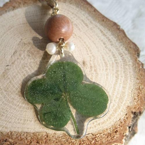 本物の四つ葉のクローバーと淡水パール、ウッドビーズを組み合わせた、ナチュラルな雰囲気のストラップです。 樹脂に閉じ込めた四つ葉のクローバーは、お守り感覚でいつも身につけていたくなりそう。 フック部分で取り外しができ、お手持ちのチェーンと合わせてペンダントトップとしてもお使い頂ける2WAY仕様です。
