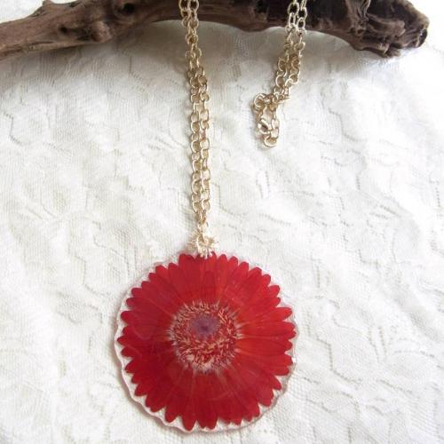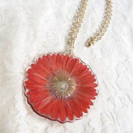 鮮やかな赤いガーベラを押し花にし、ネックレスに仕上げています。 樹脂なので、見た目よりも軽い使用感。コーディネートしやすいロングタイプのネックレスです。 「本物の花を身につける幸せ」を感じて下さい。