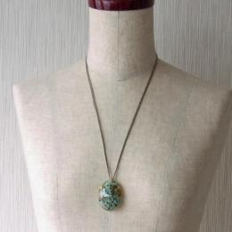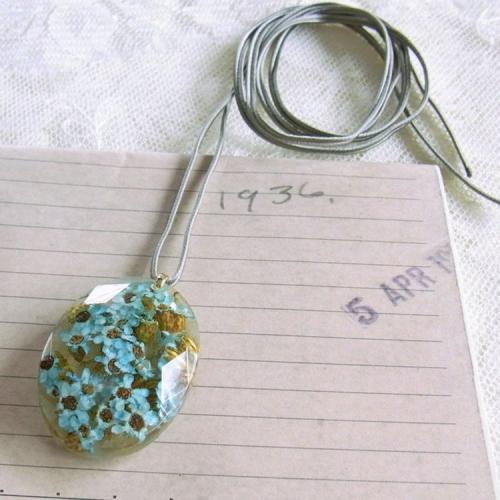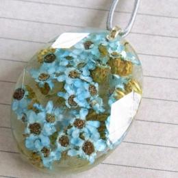 ミントグリーンの可愛い小花を閉じ込め、ネックレスに仕上げました。