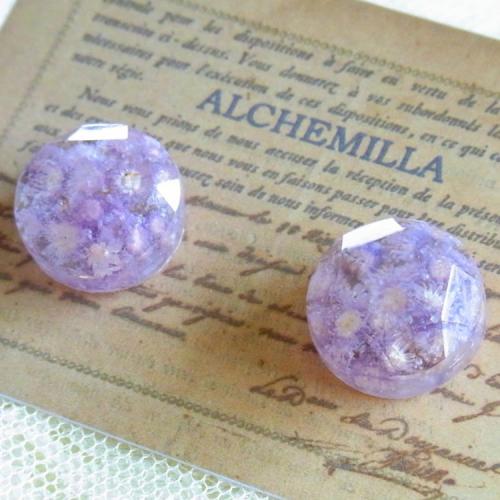 優しい色合いのドライフラワーを樹脂に閉じ込め、ピアスに仕上げました。