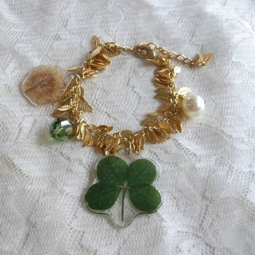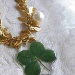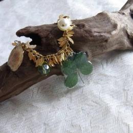 幼いころ、夢中で探した四つ葉のクローバー。お姫様気分で編んだシロツメクサの花冠…。 そんなノスタルジックな気持ちを、ブレスレットに仕上げました。 樹脂に閉じ込めた四つ葉のクローバーが、幸せをもたらしてくれそうなアクセサリーです。