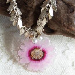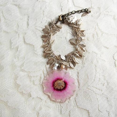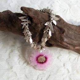 華やかなピンクのローダンセを樹脂に閉じ込めたブレスレット。 白とオレンジの淡水パールが可憐な印象です。シルバーカラーのリーフチェーンが揺れ、コーディネートに花を添えてくれます。