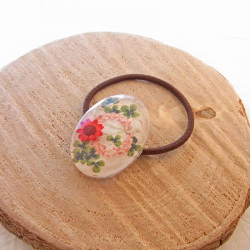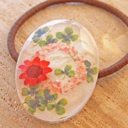 樹脂の中にドライフラワーを閉じ込め、ヘアアクセサリーに仕上げました。 モチーフ表面はカットを施されたようになっており、動くたびにキラキラと光を反射します。 ベース部分は、ヴィンテージのポストカードの絵柄を元にプリントしたもので、雰囲気のある一品です。 裏面に貼られたレースも隠れたポイントになっています。 さっと髪をまとめるだけで、可愛いヘアアレンジが完成の便利なアイテム。 手首に通して、ブレスレットのような使い方もオススメです。