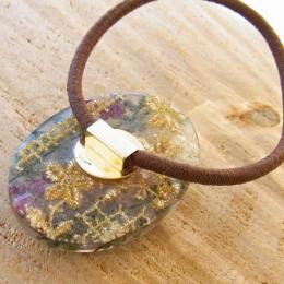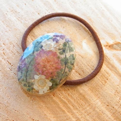 樹脂の中に数種類のドライフラワーを閉じ込め、ヘアアクセサリーに仕上げました。 苔を思わせるグリーンの中に、白やピンクの花が映え、ナチュラルな印象です。 モチーフ表面はカットを施されたようになっており、動くたびにキラキラと光を反射します。 モチーフ部分の裏面には金色のレースが貼られており、表から透けて見え、アクセントになっています。 さっと髪をまとめるだけで、可愛いヘアアレンジが完成の便利なアイテム。 手首に通して、ブレスレットのような使い方もオススメです。