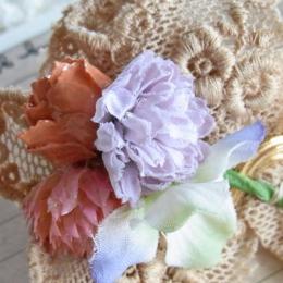 優しい色味のアートフラワー(造花)と紅茶染めをしたレースが、アンティークな雰囲気を醸し出しています。