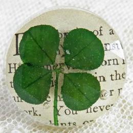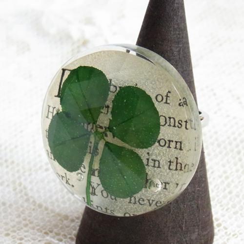 本物の四つ葉のクローバーと、ヴィンテージの洋書のきれはしを閉じ込めたリング。