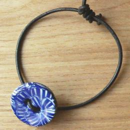 手軽に気軽に楽しんでいただきたいとの想いで、太さ2mmの皮ひもを通し、シンプルに楽しめるブレスレットにしました。