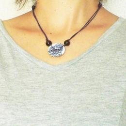 太さ1mm×2本の柔らかい皮ひもを通し、ネックレスにしました。長さもお好みで変えられる仕様になっていますので、お洋服に合わせて楽しむことができます。