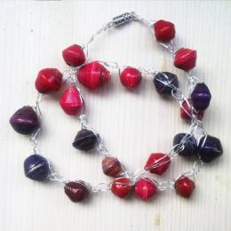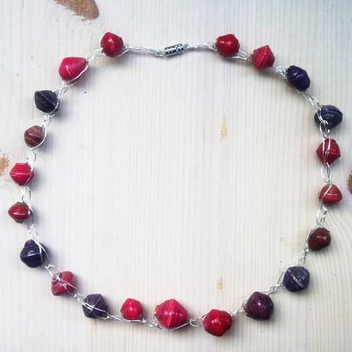 再生紙から出来たCaring Handsのビーズと銅ワイヤーの糸を使用したMaijaオリジナルのカギ編みネックレスシリーズ「Koruttomuus(コルットムース)」(英語で“ジュエリーをつけないシンプルビューティー”の意)。