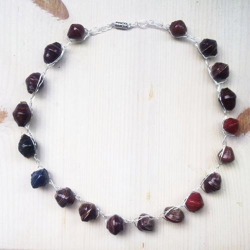 再生紙から出来たCaring Handsのビーズと銅ワイヤーの糸を使用したMaijaオリジナルのカギ編みネックレスシリーズ「Koruttomuus(コルットムース)」(英語で“ジュエリーをつけないシンプルビューティー”の意)。