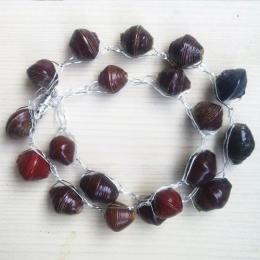 Kahaviはフィンランド語で「コーヒー」という意味。フィンランド人は本当によくコーヒーを飲みます。私はコーヒーはブラックで飲むのが好きです。美味しいコーヒーに見られるダークブラウンの幾重もの層のイメージを、ケアリングハンズの再生紙ビーズに重ねました。