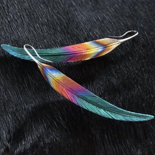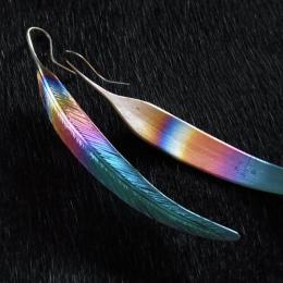 チタンの陽極酸化で色づけした羽のロングピアス。
